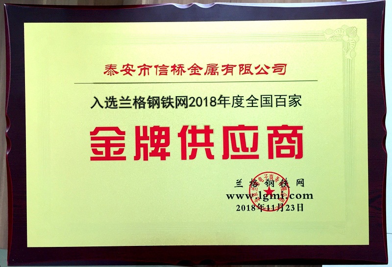 會議過后后,是眾多鋼企,鋼貿(mào)商期待的頒獎環(huán)節(jié),泰安市信橋金屬有限公司再獲殊榮,榮獲蘭格網(wǎng)“2018年度全國百家金牌供應商稱號”。頒獎現(xiàn)場熱鬧非凡,參會人員倍感榮幸。